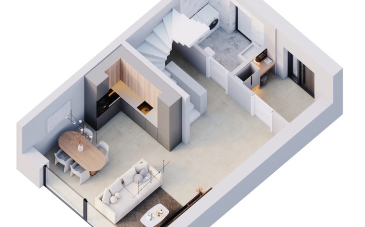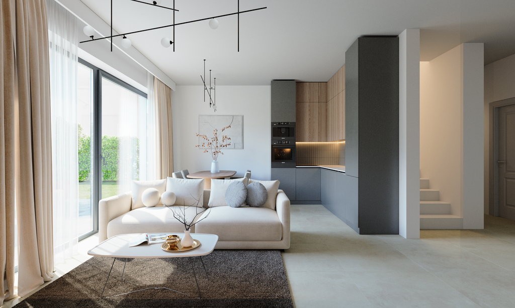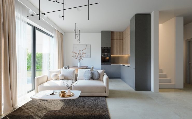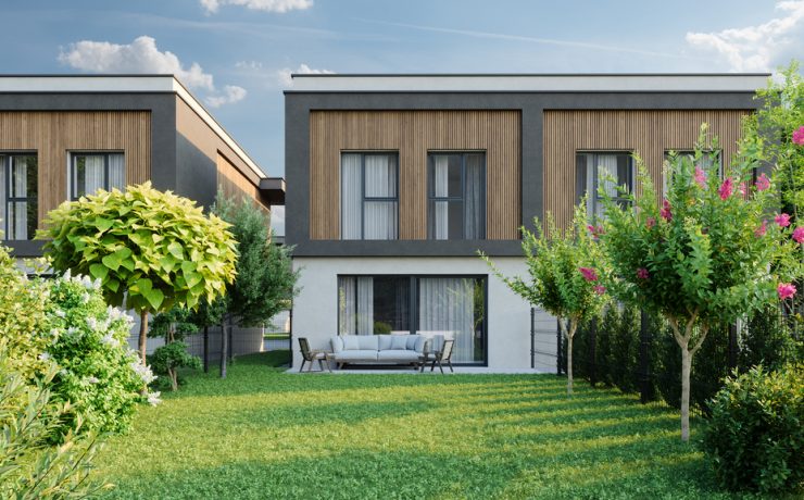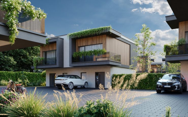Każdy dom oferuje starannie przemyślany układ pomieszczeń, zapewniający wyraźny podział na reprezentacyjną strefę dzienną oraz prywatną część wypoczynkową. Duże przeszklenia doświetlają wnętrza naturalnym światłem, a bezpośrednie wyjście do ogrodu pozwala płynnie połączyć przestrzeń domu z otoczeniem zieleni.