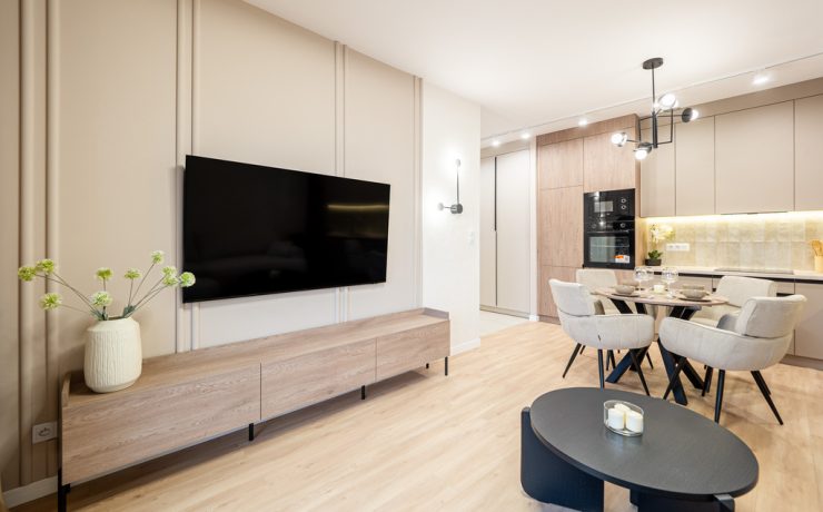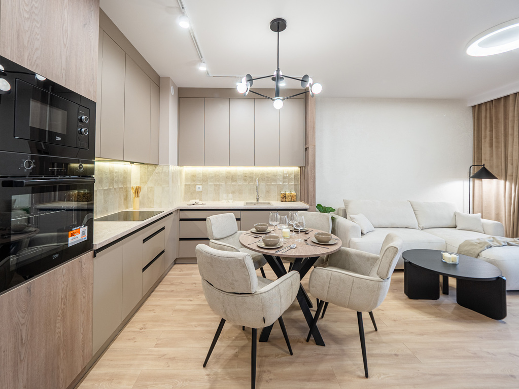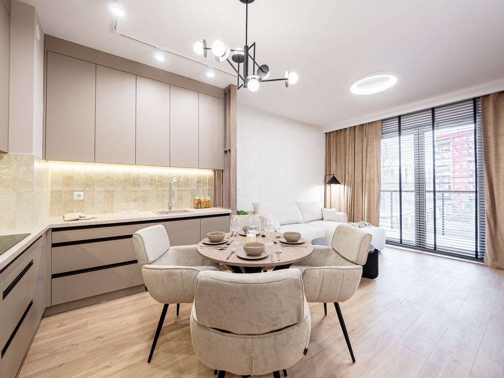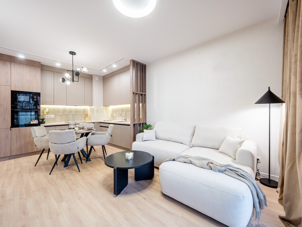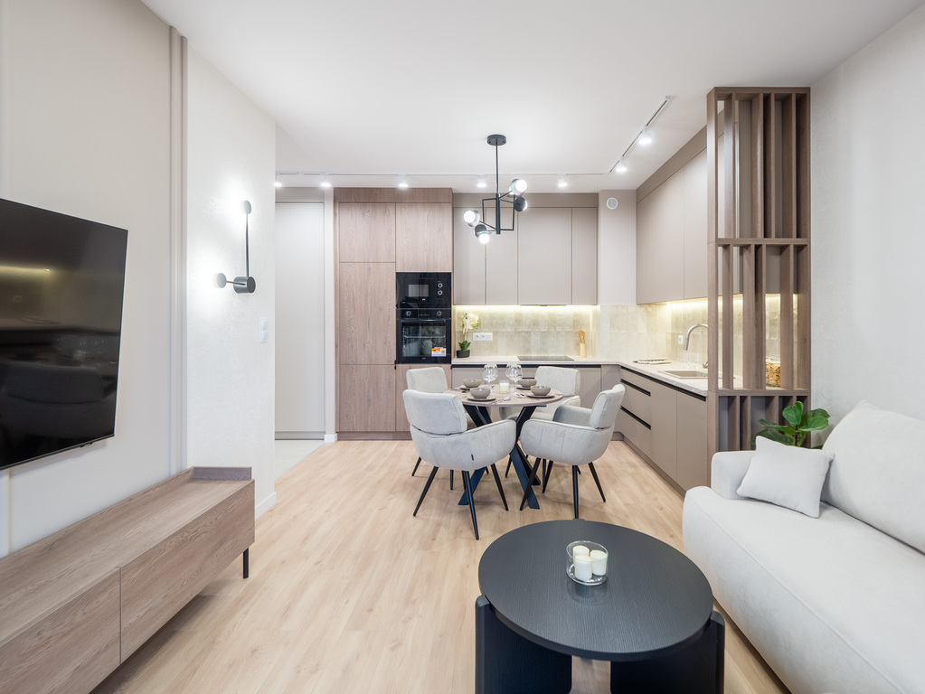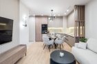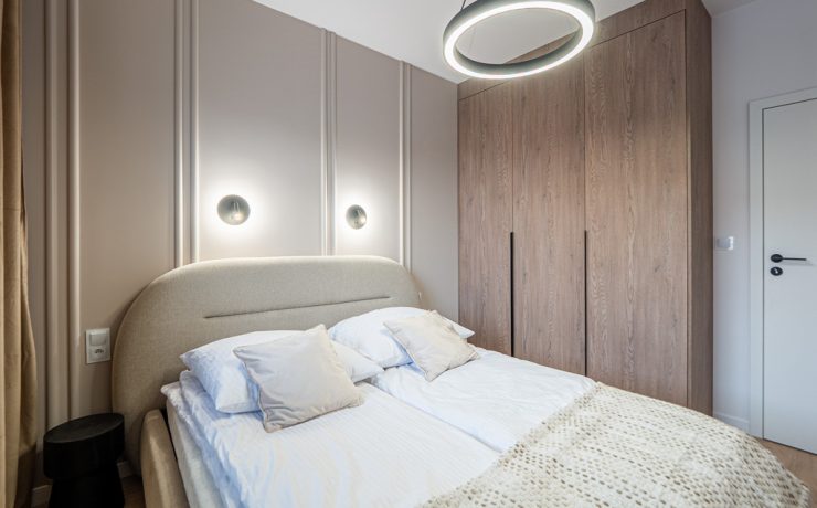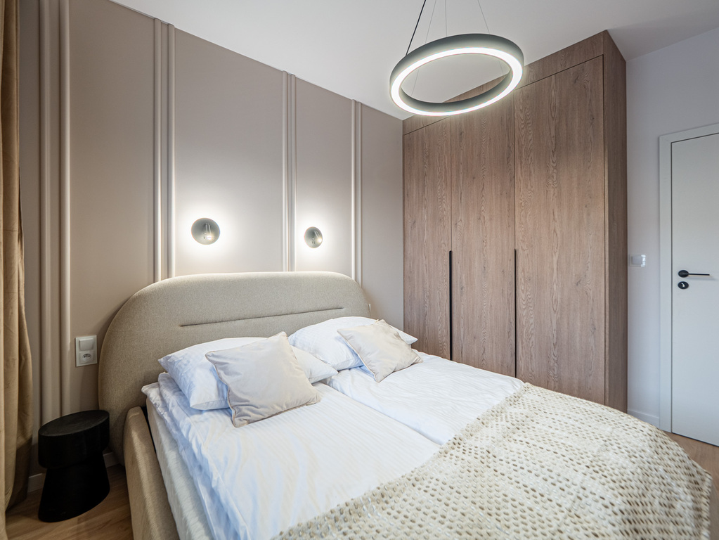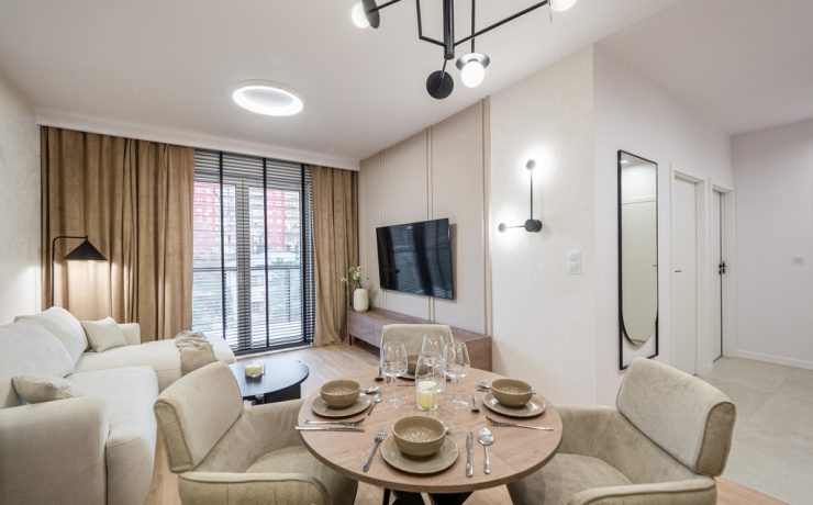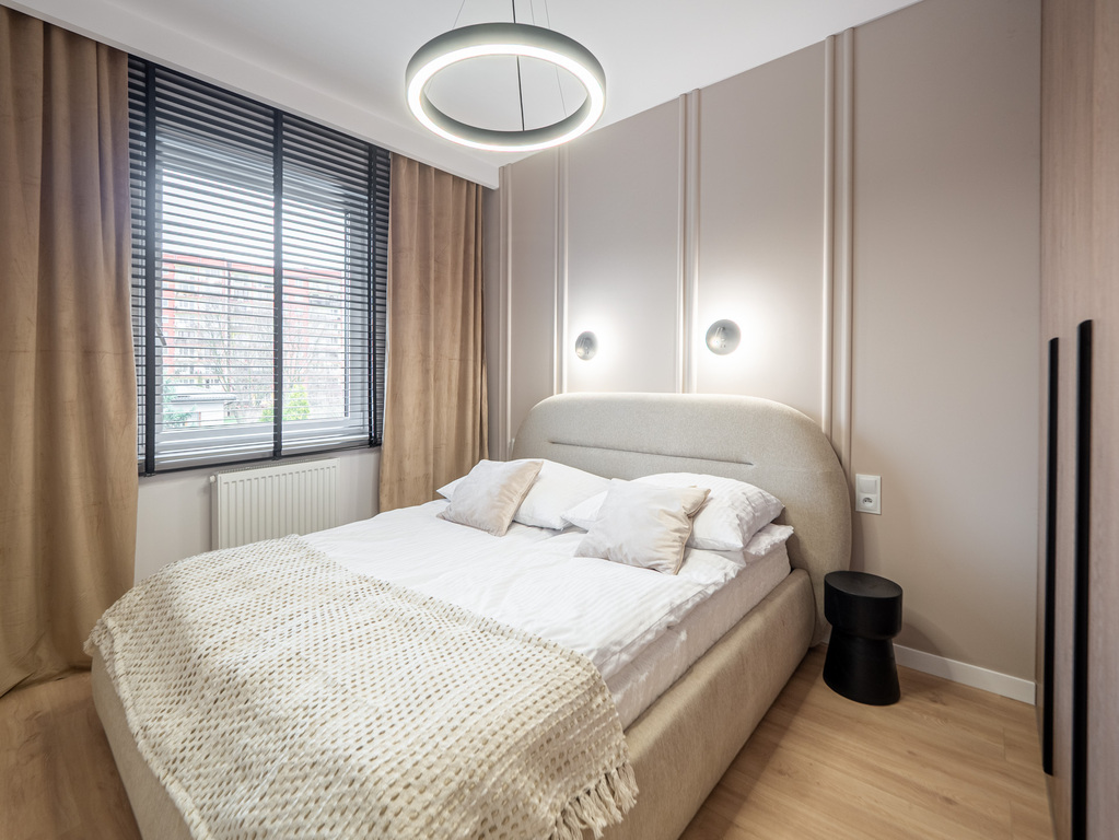 Mieszkanie zostało zaprojektowane przez doświadczonego architekta wnętrz, łącząc nowoczesną stylistykę z maksymalną funkcjonalnością przestrzeni. Do wykończenia użyto wysokiej jakości materiałów, zabudowy meblowe wykonane są na wymiar przez stolarza. Mieszkanie jest wyposażone w sprzęty takie jak płyta indukcyjna, piekarnik, kuchenka mikrofalowa, lodówka w zabudowie, pralka czy telewizor. Jest kompletnie umeblowane i gotowe do zamieszkania.