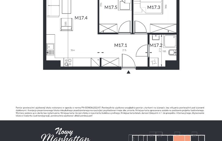 Układ mieszkania: przedpokój, łazienka z WC, salon z aneksem kuchennym oraz dwie niezależne sypialnie.
