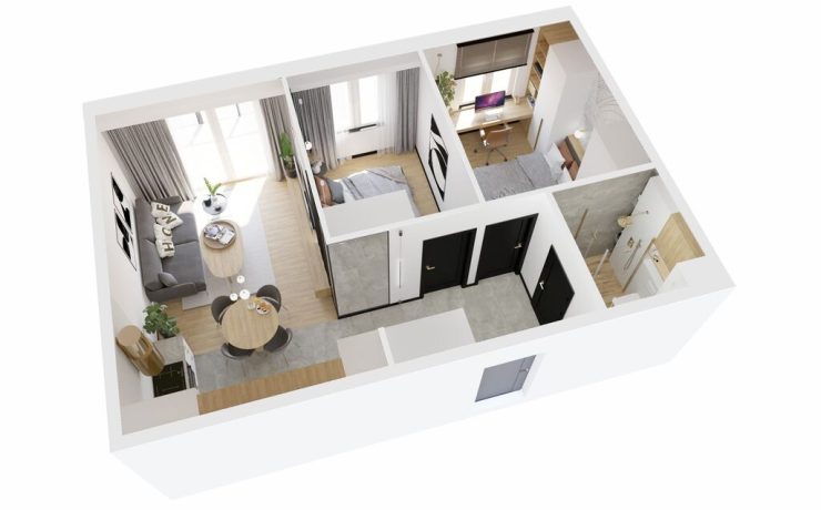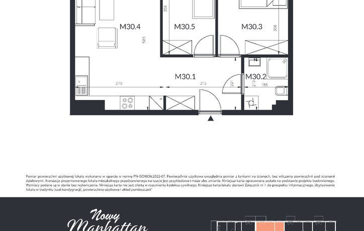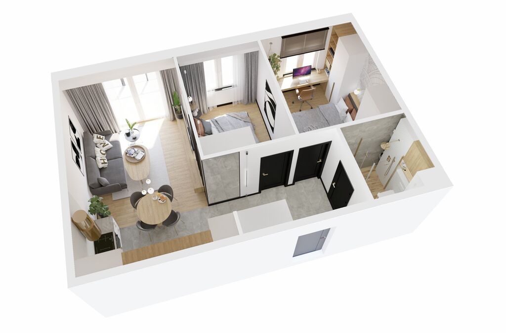 Układ mieszkania: przedpokój, łazienka z WC, pokój 1, pokój 2, salon z aneksem kuchennym.