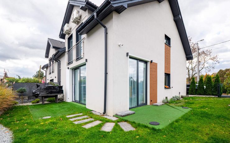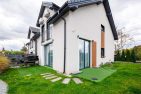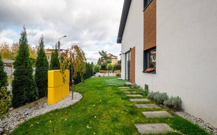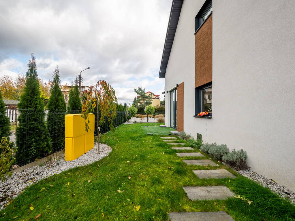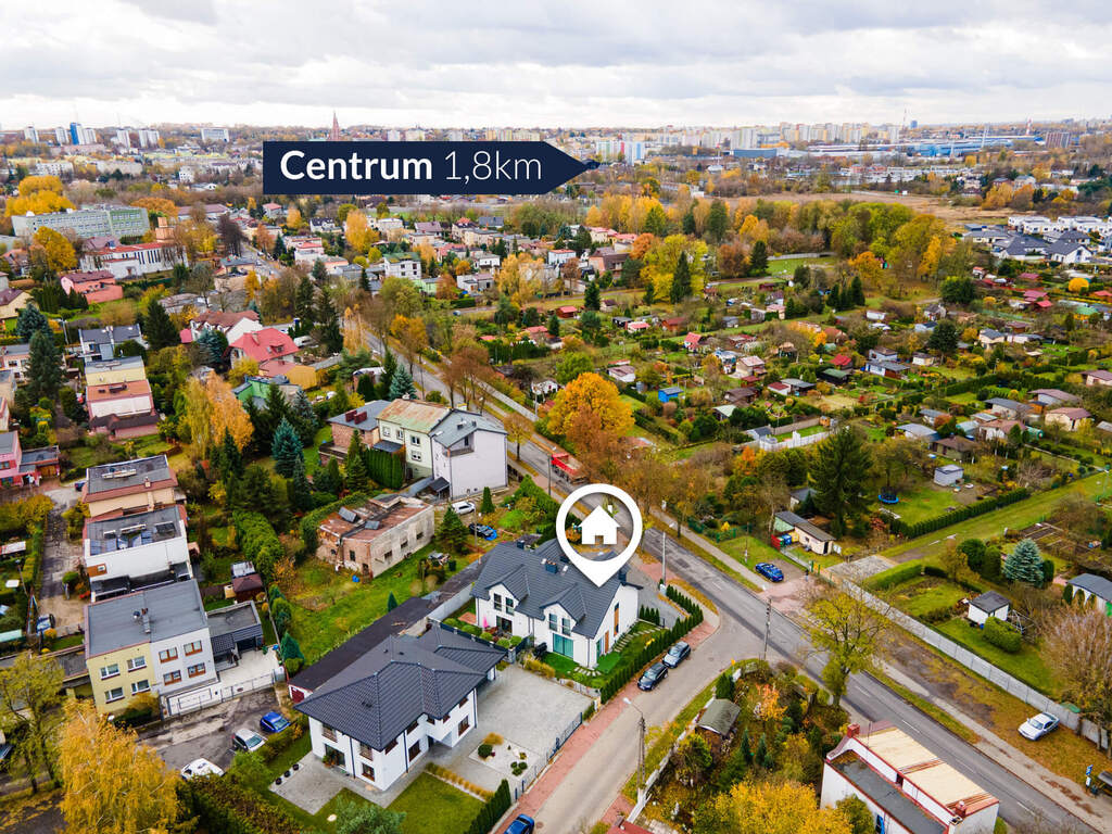 Dom znajduje się na płaskiej działce o łącznej powierzchni 615 m2 ( udział 1/2) wśród nowoczesnej zabudowy jednorodzinnej. Bryła budynku nowoczesna , dach wielospadowy , funkcjonalny układ pomieszczeń.