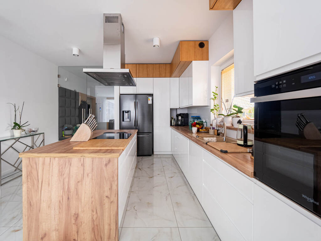 Trwałe zabudowy takie jak zabudowa kuchenna wraz ze sprzętem AGD, zabudowa garderoby, zabudowa w przedpokoju oraz w garażu oraz większość mebli widocznych na zdjęciach zostaje na wyposażeniu i jest ujęte w cenie.