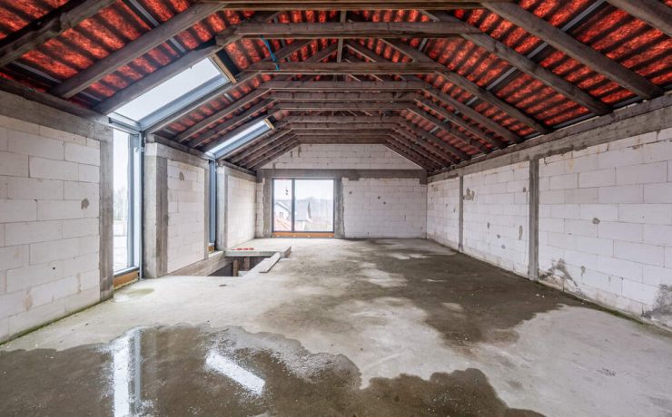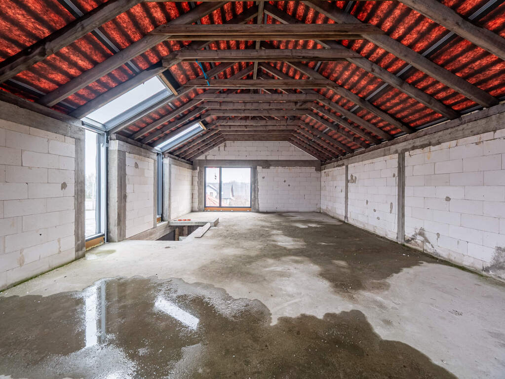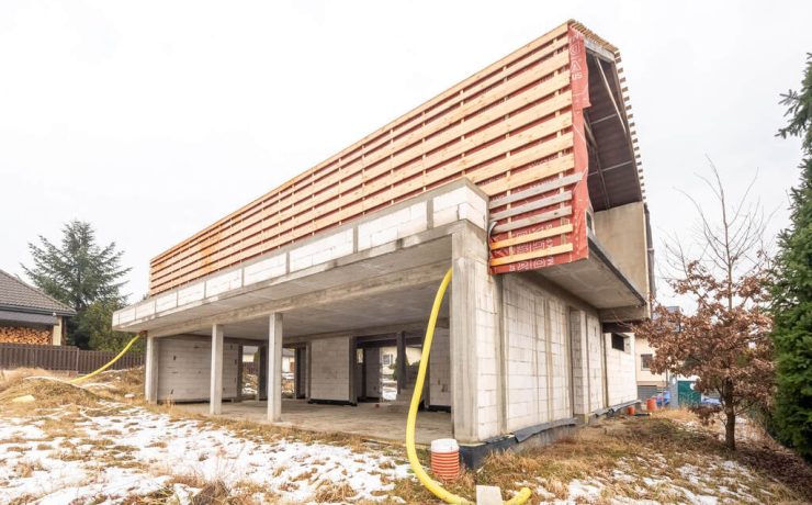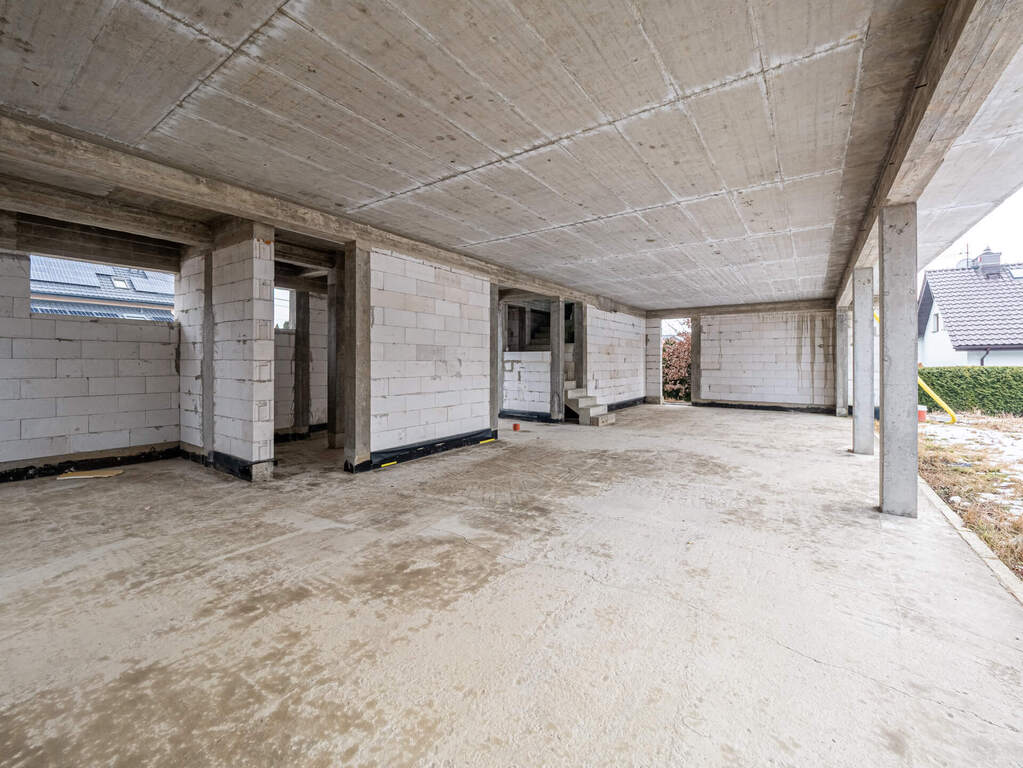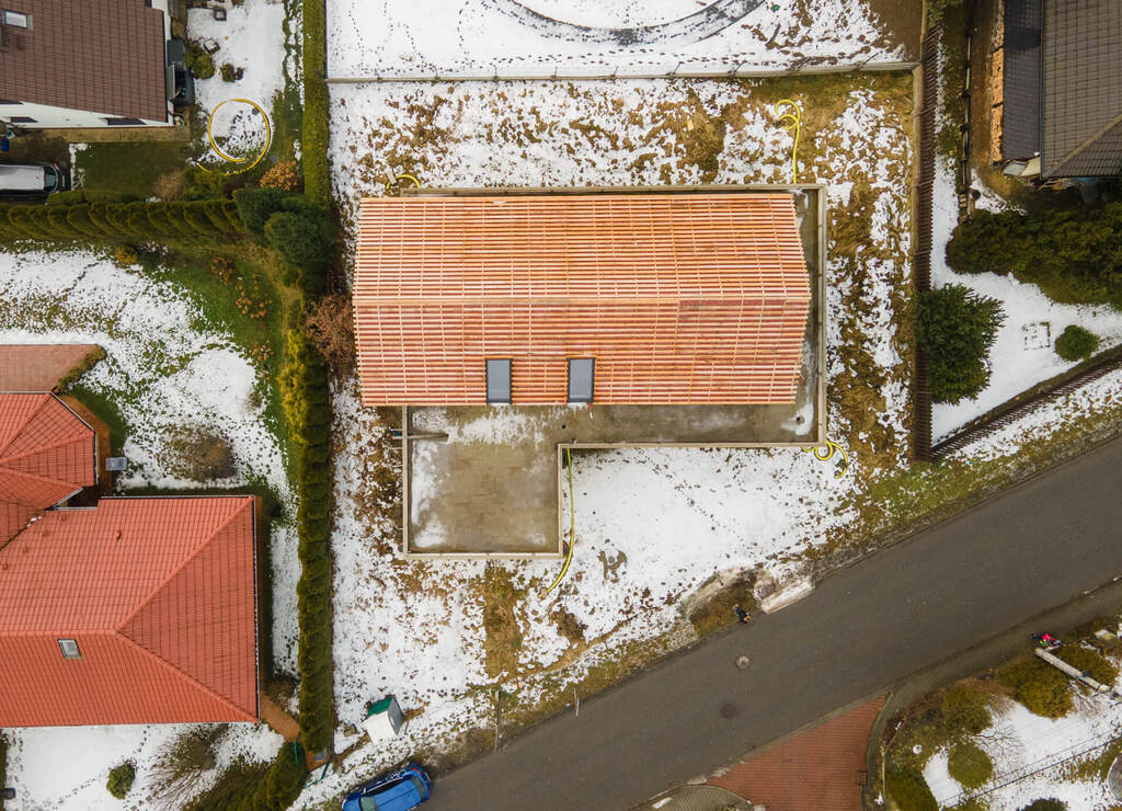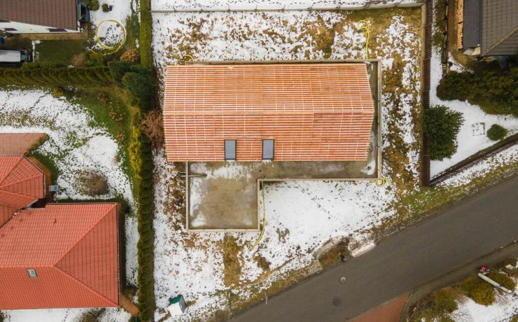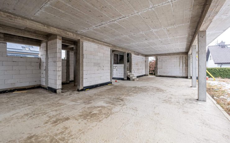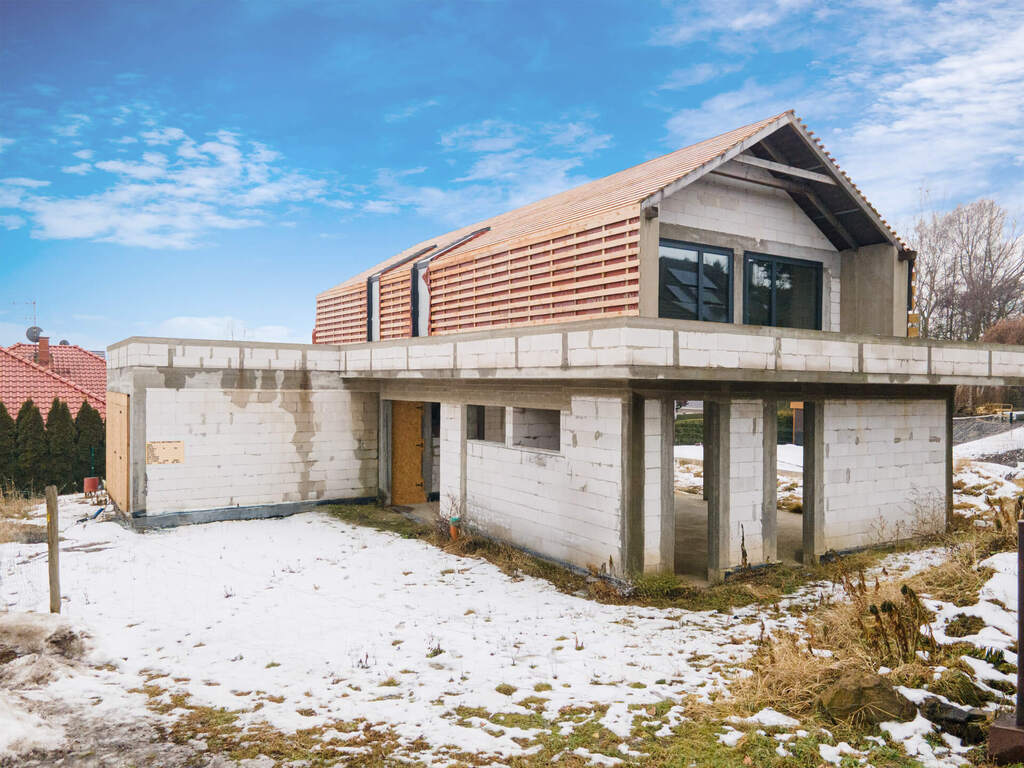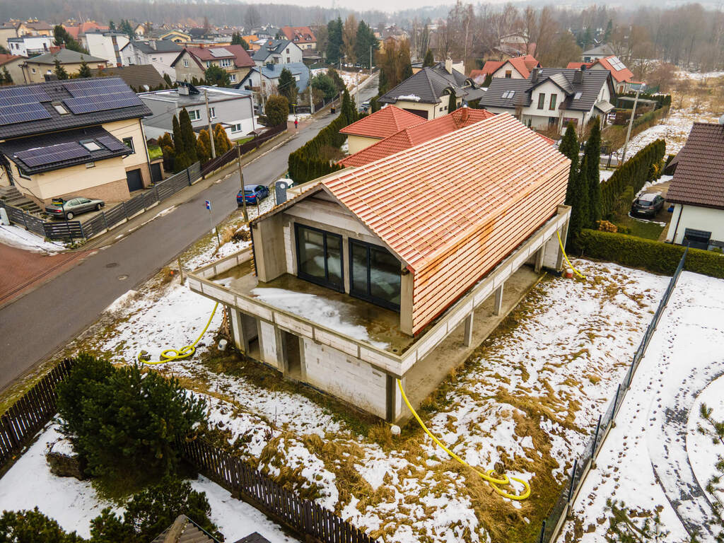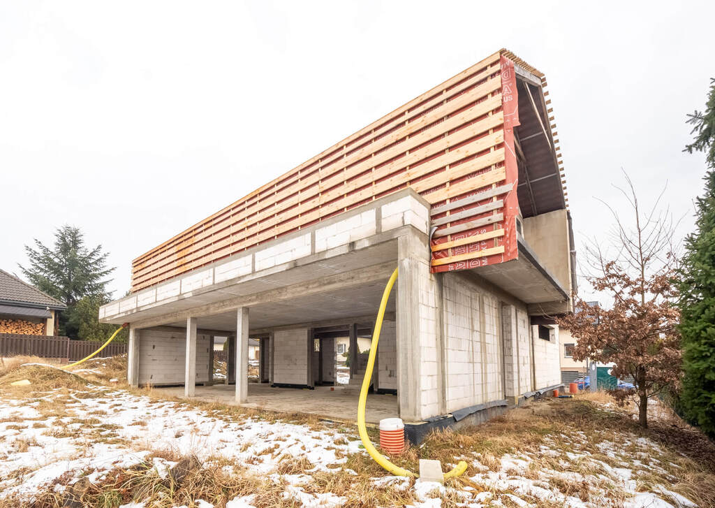 Dom wybudowany został w technologii tradycyjnie, posadowiony na ławach fundamentowych. Ściany zewnętrzne i wewnętrzne wykonane z betonu komórkowego. Dach w konstrukcji drewnianej, kryty blachą na rąbek. Dom będzie doprowadzony do stanu surowego zamkniętego. Na terenie działki znajduje się studnia deszczowa.