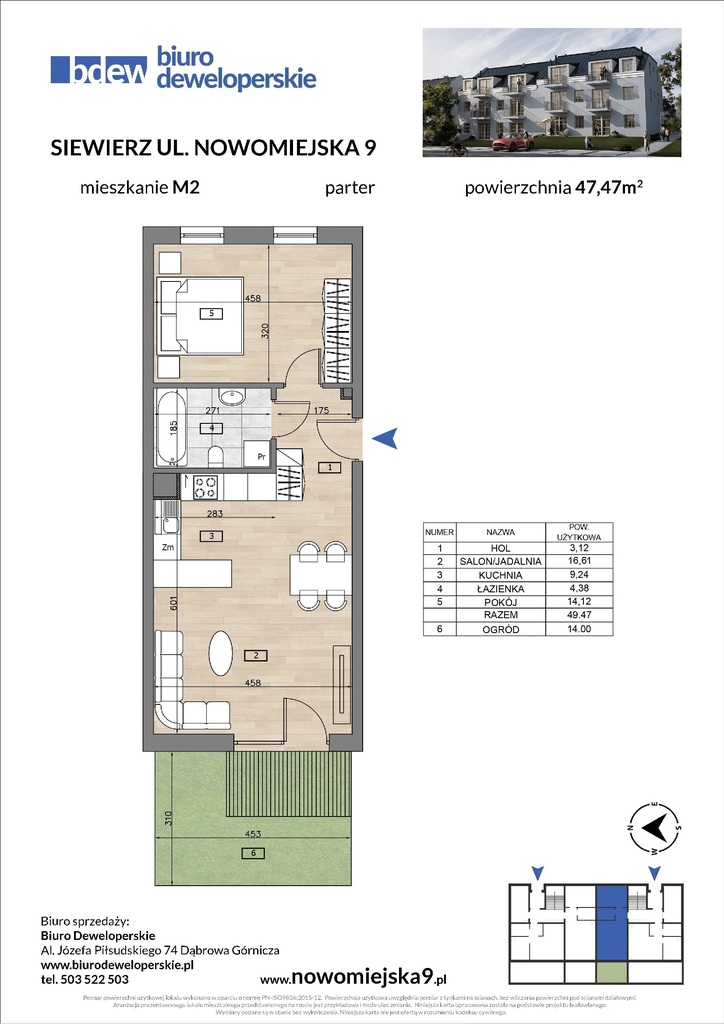 Przedmiotem ogłoszenia jest 2-pokojowe mieszkanie numer 2 położone na parterze w inwestycji Nowomiejska 9 w Siewierzu. To wyjątkowy lokal o powierzchni 47,47 m kw., na którą składają się: część dzienna z aneksem kuchennym, sypialnia, łazienka z toaletą oraz przestronny balkon. Cechą inwestycji jest wysoki standard i świetna lokalizacja.