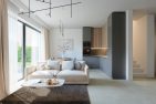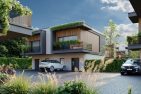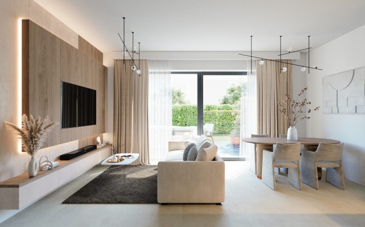 Każdy dom oferuje starannie przemyślany układ pomieszczeń, zapewniający wyraźny podział na reprezentacyjną strefę dzienną oraz prywatną część wypoczynkową. Duże przeszklenia doświetlają wnętrza naturalnym światłem, a bezpośrednie wyjście do ogrodu pozwala płynnie połączyć przestrzeń domu z otoczeniem zieleni.