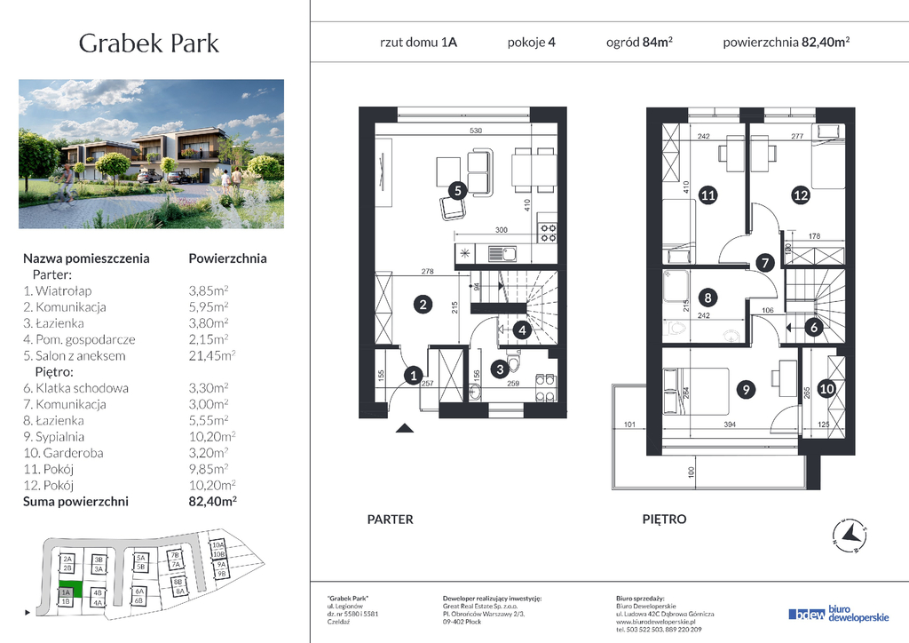 Grabek Park to kameralna inwestycja stworzona z myślą o osobach, które oczekują od miejsca zamieszkania czegoś więcej niż tylko metrażu. W ramach osiedla powstaje 20 eleganckich domów w zabudowie bliźniaczej o powierzchni 82 m², zaprojektowanych w nowoczesnej architekturze i z dbałością o komfort codziennego życia.