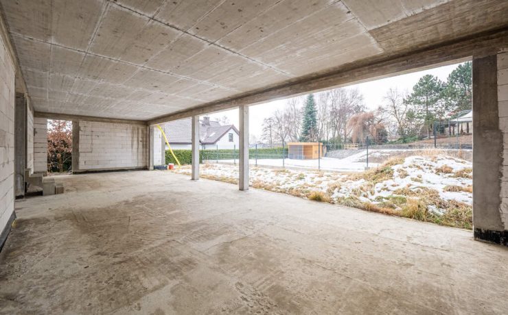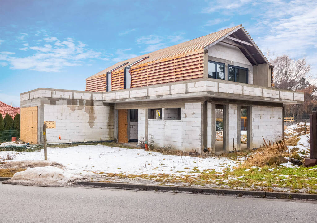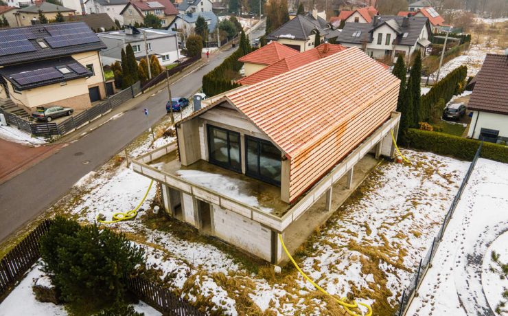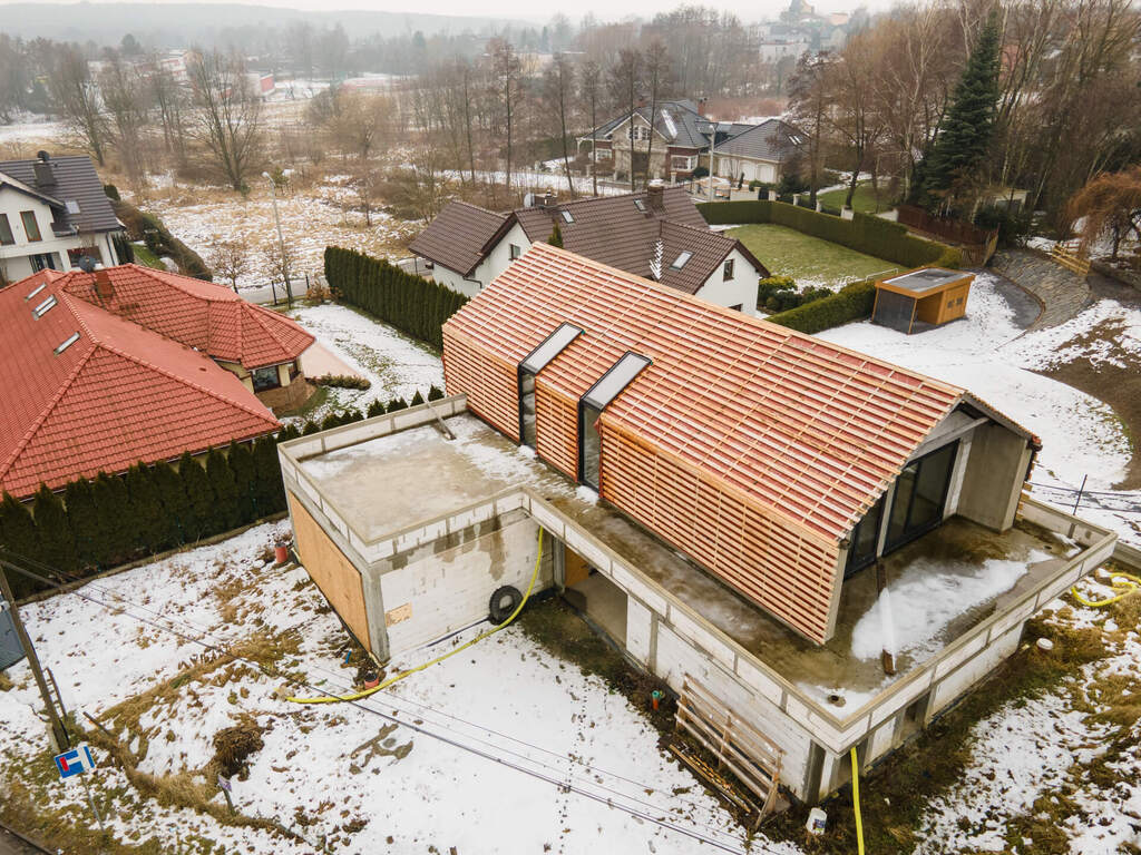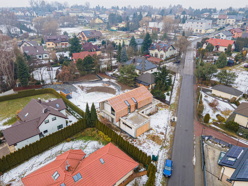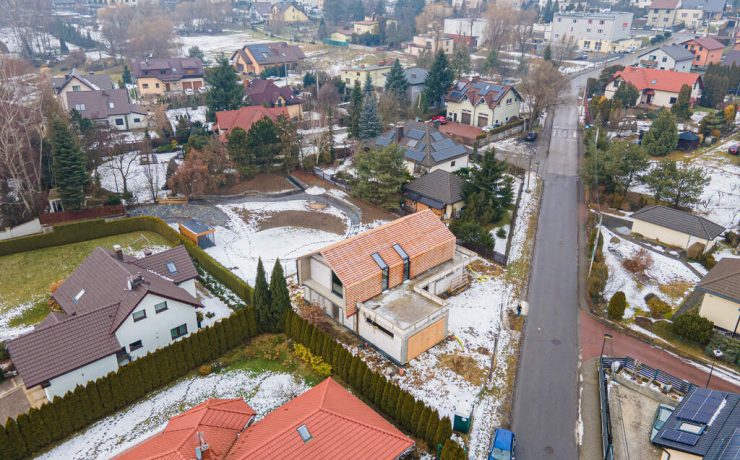 Dom wybudowany został w technologii tradycyjnie, posadowiony na ławach fundamentowych. Ściany zewnętrzne i wewnętrzne wykonane z betonu komórkowego. Ocieplenie ze styropianu o grubości 15 cm pokrytego tynkiem silikatowym. W całym domu aluminiowa, trzyszybowa stolarka aluminiowa w kolorze antracytowym. Dach w konstrukcji drewnianej, kryty blachą na rąbek. Dom będzie doprowadzony do stanu deweloperskiego. Zostaną w nim wykonane instalacje wod- kan oraz elektryczna (możliwość dostosowania na etapie wykonania). W domu zostanie zamontowany również kocioł gazowy z zasobnikiem na ciepłą wodę. Na terenie działki znajduje się studnia deszczowa.