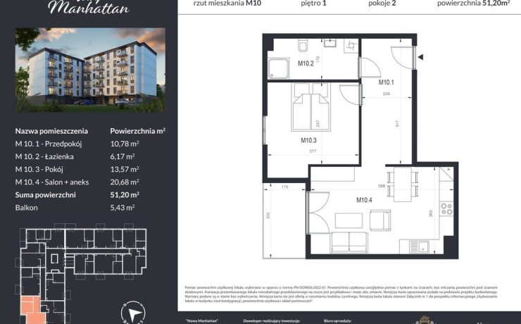 Mieszkanie posiada balkon zlokalizowany na zachód o powierzchni 5,43 m2.