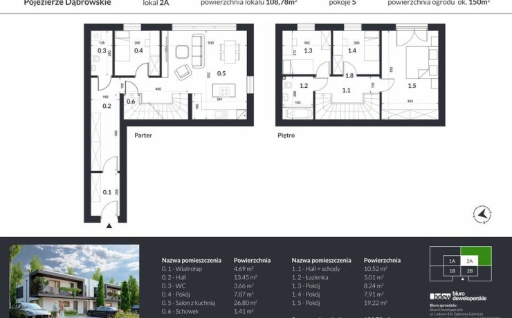Parter: wiatrołap, hall, toaleta, pokój, schowek, strefa dzienna z aneksem kuchennym