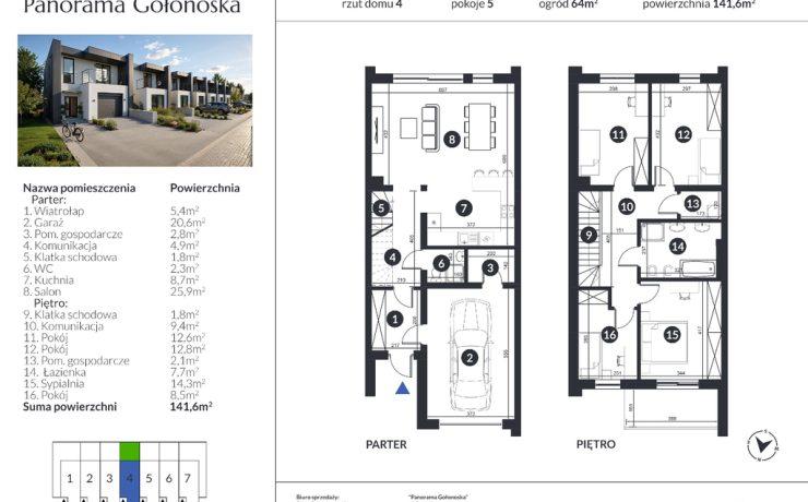 Panorama Gołonoska to kameralne osiedle domów w zabudowie szeregowej. Inwestycja powstanie w dwóch etapach – pierwszy 4 domy, które będą gotowe do obioru jeszcze w tym roku. Kolejny etap, w ramach którego powstaną 3 domy, ruszy niebawem i będzie gotowy pod koniec roku 2027. Zaprojektowane w przemyślany sposób wnętrze łączy funkcjonalność z wygodą użytkowania przyszłych właścicieli. o idealna propozycja dla rodzin, które chcą połączyć komfort domu z wygodą miasta.